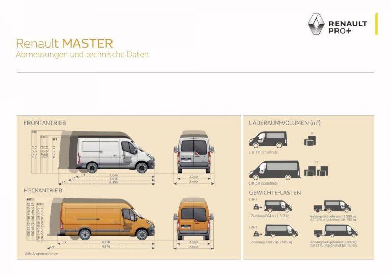 Abmessungen. Renault MASTER: Technische Daten . Geschlossener Transport, offener Transport und Personenbeförderung: Entdecken Sie die Abmessungen und Gewichte.