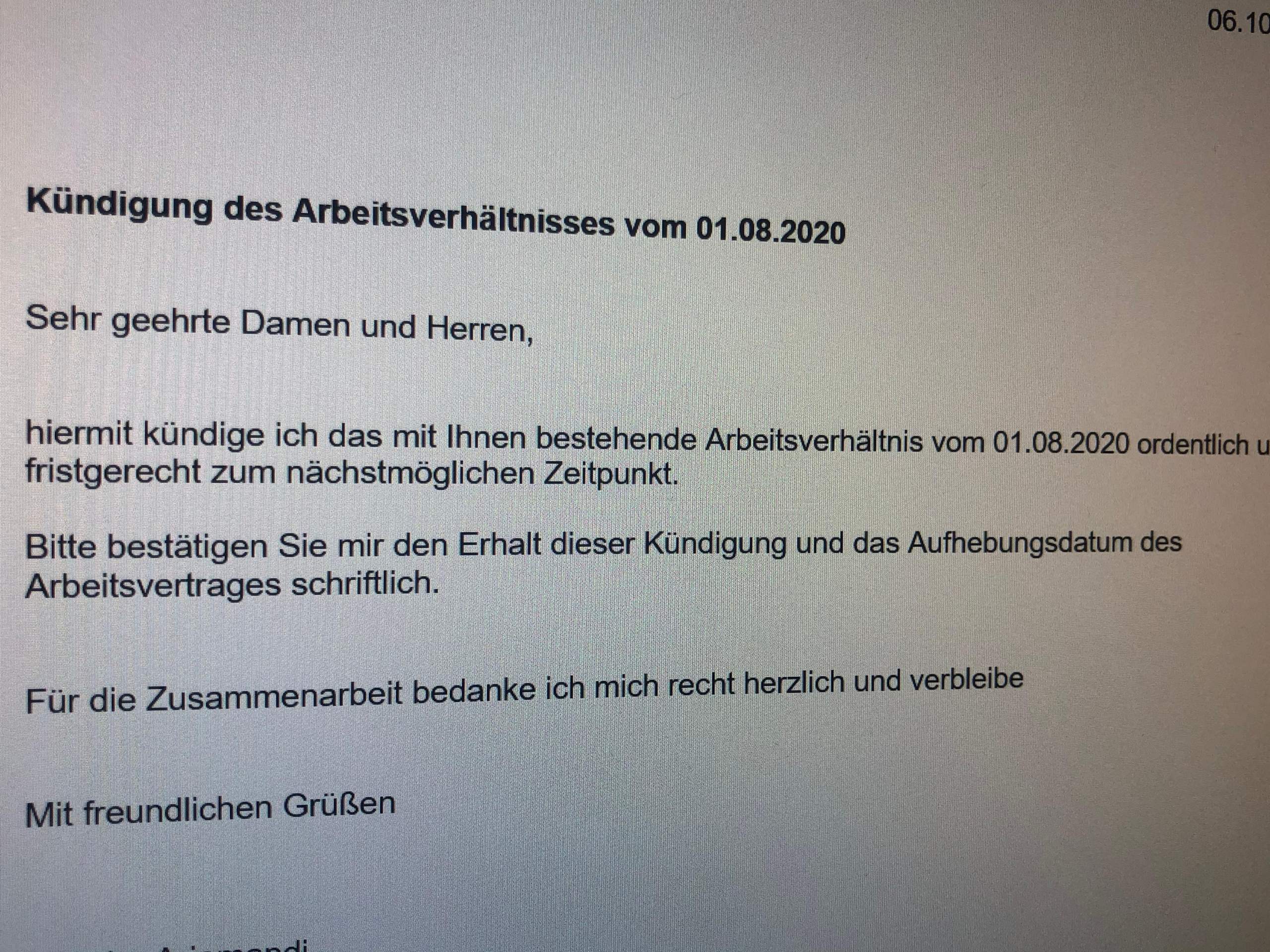 Bei der Kündigung solltest du das aktuelle Datum schreiben, an dem du die Kündigung versendest. So hast du einen Beweis, dass du die Kündigung zu diesem Zeitpunkt abgeschickt hast. Wenn du eine Kündigung schreibst, solltest du darauf achten, dass das Datum korrekt angegeben ist. Kündigung des Arbeitsverhältnisses - Bestätigung erbeten.