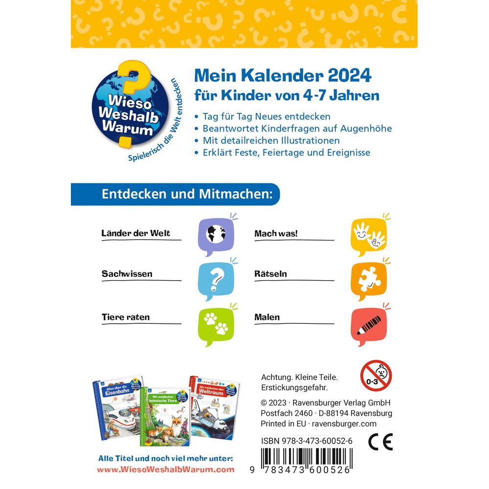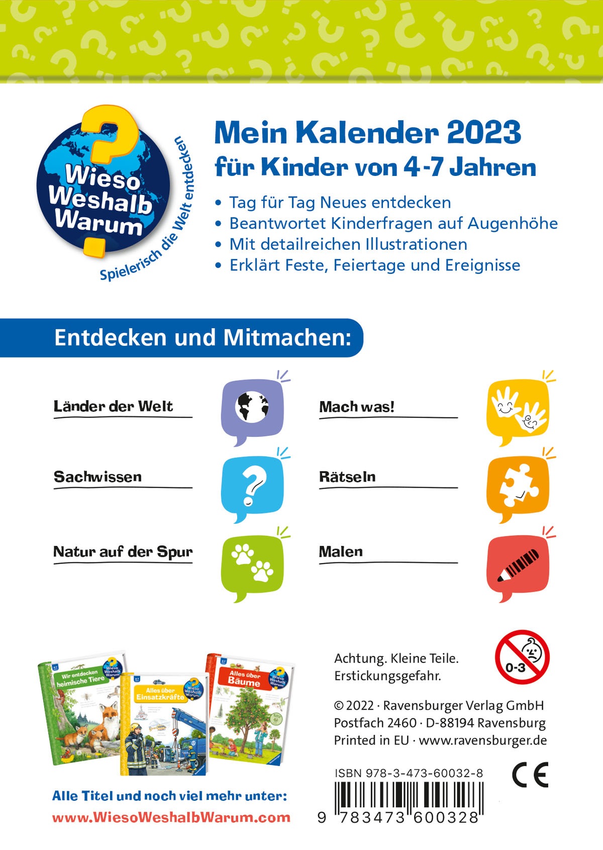 Wieso? Weshalb? Warum? Kalender 2024. ISBN 978-3-473-60052-6. 640 Seiten. € 12,00. Ravensburger. Ab 4. Thalia. buecher.de. Amazon. Inhaltsangabe: Woher hat der März seinen Namen? Wie entsteht ein Schmetterling? Warum ist Lachen gesund? Mit diesem Tagesabreißkalender entdecken Kinder täglich neues Wissen, Rätsel, Ausmalbilder und.